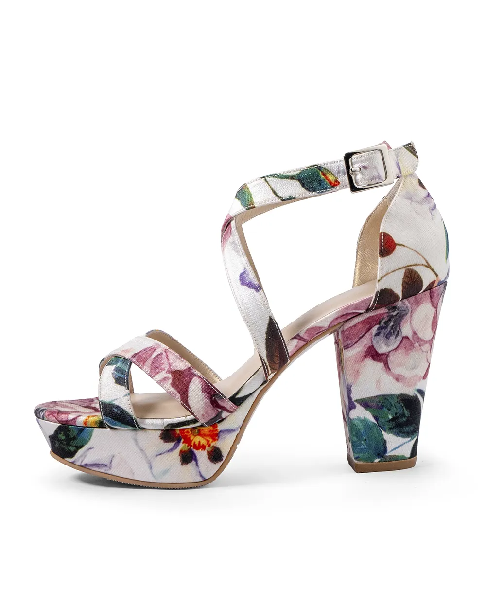 Sandalias elaboradas en tela estampada, perfectas para tus eventos llenos de color. Un par imprescindible para esta temporada.