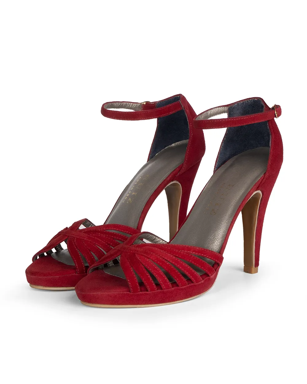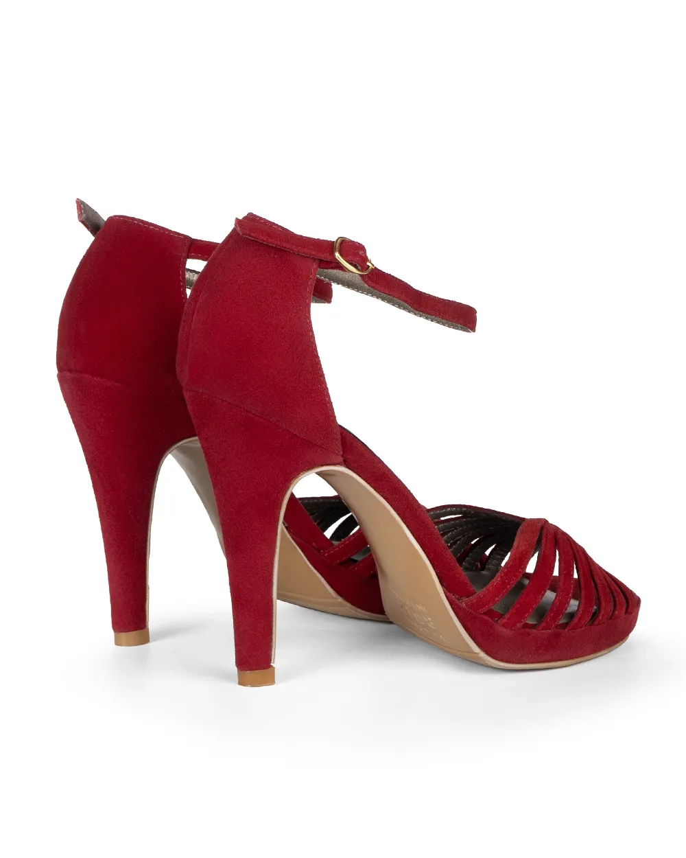Sandalia de finas tiras que resalta por su sutileza y elegancia, elaborada en ante color rojo vino acompañado de un tacón fino.