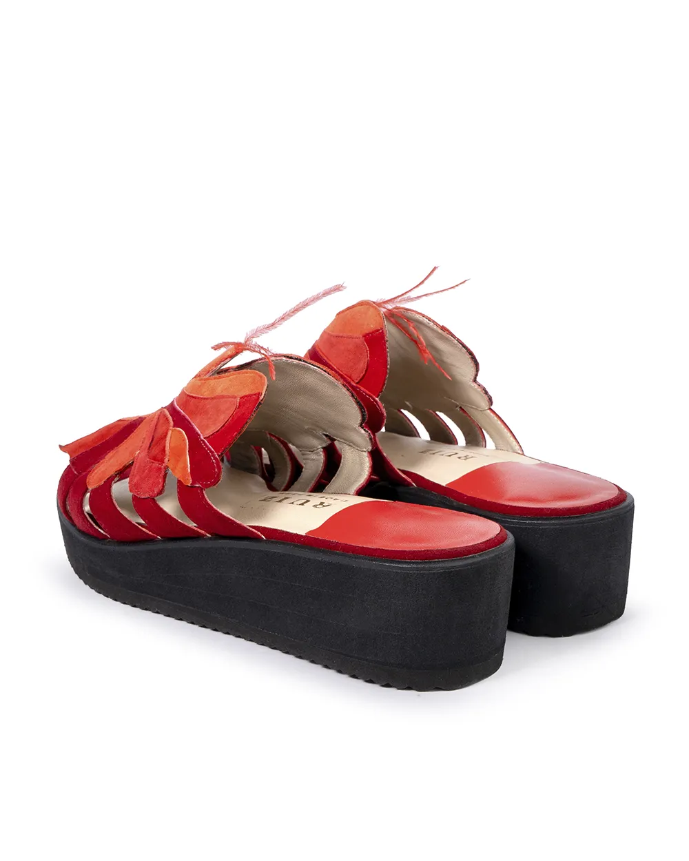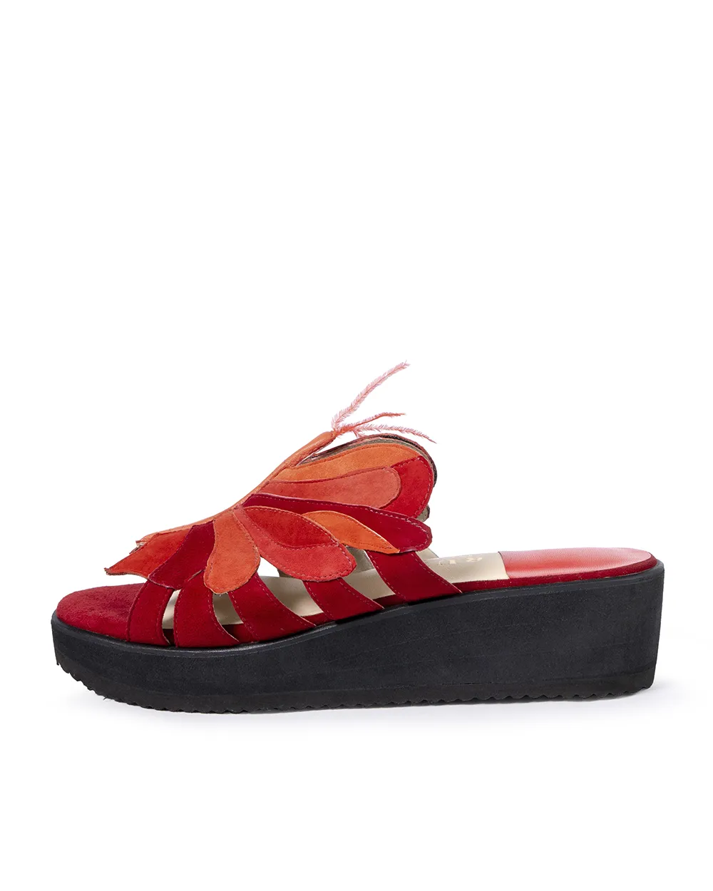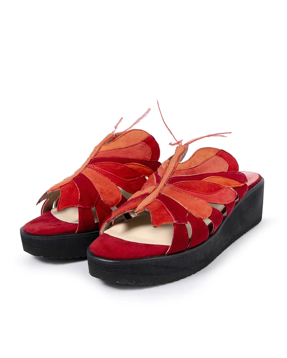 Livianas y cómodas son este par de sandalias elaboradas en ante de tonos rojos, con el detalle de una mariposa trabajada a mano en la capellada . Ideal para resaltar tu look casual.