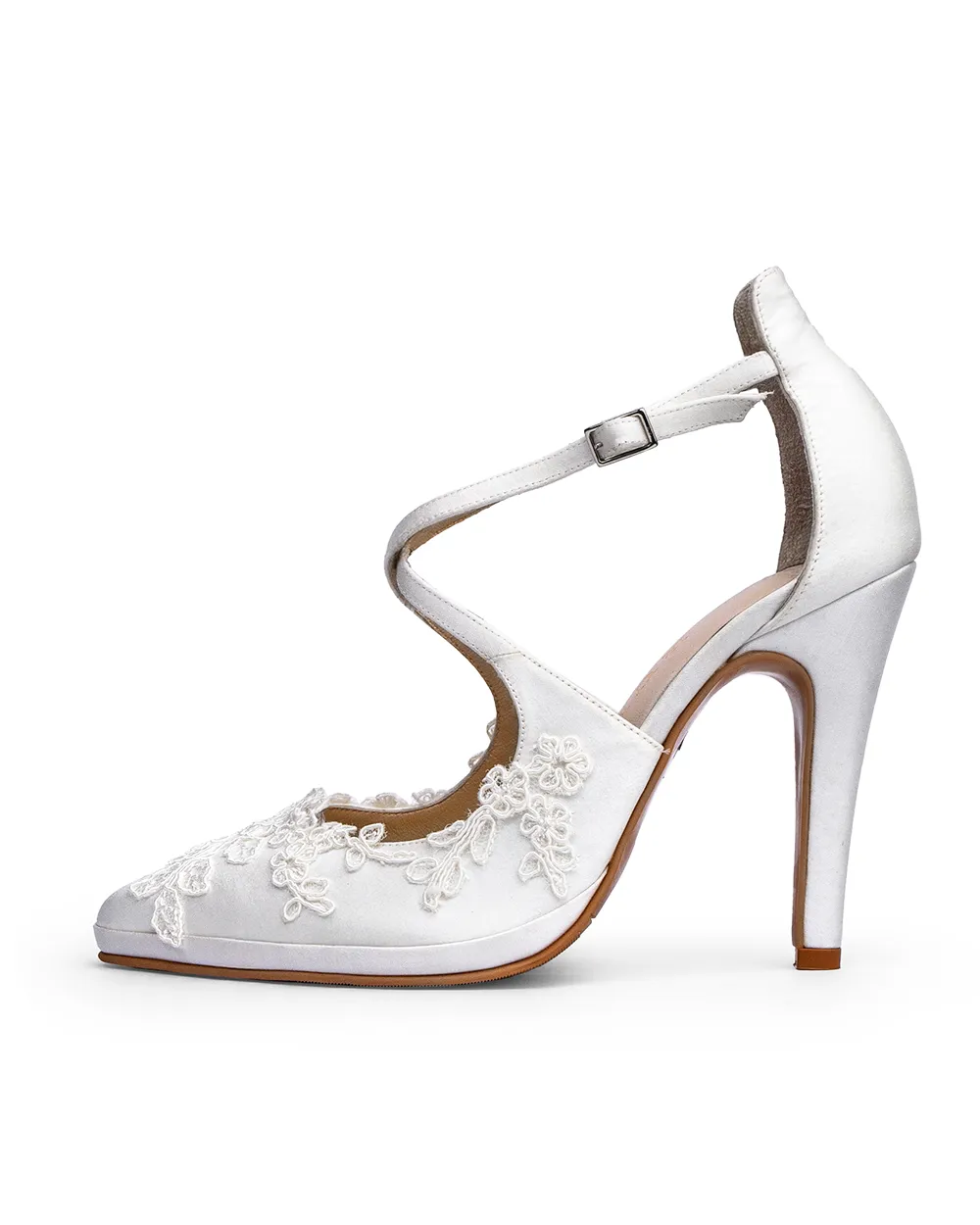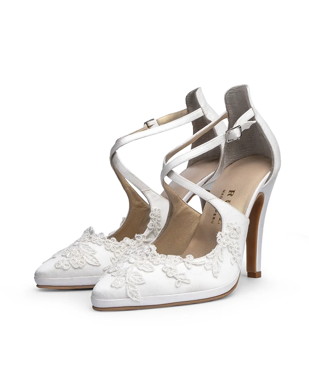 Cómodo diseño con tiras cruzadas al empeine y silueta de punta y tacón fino elaborada artesanalmente en raso de tono Ivory y adornado con sutiles piezas de encaje que definirá tu estilo.