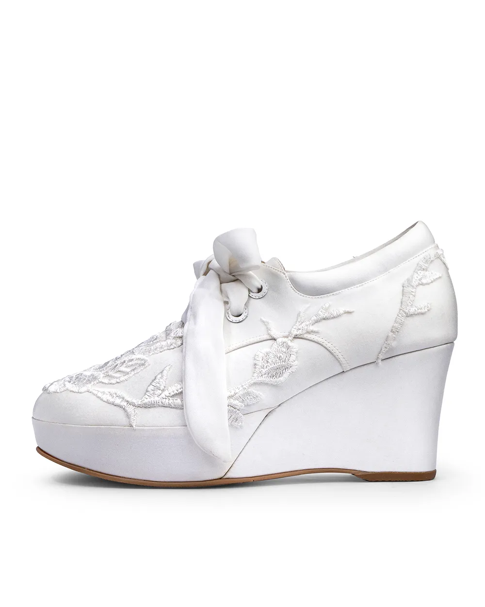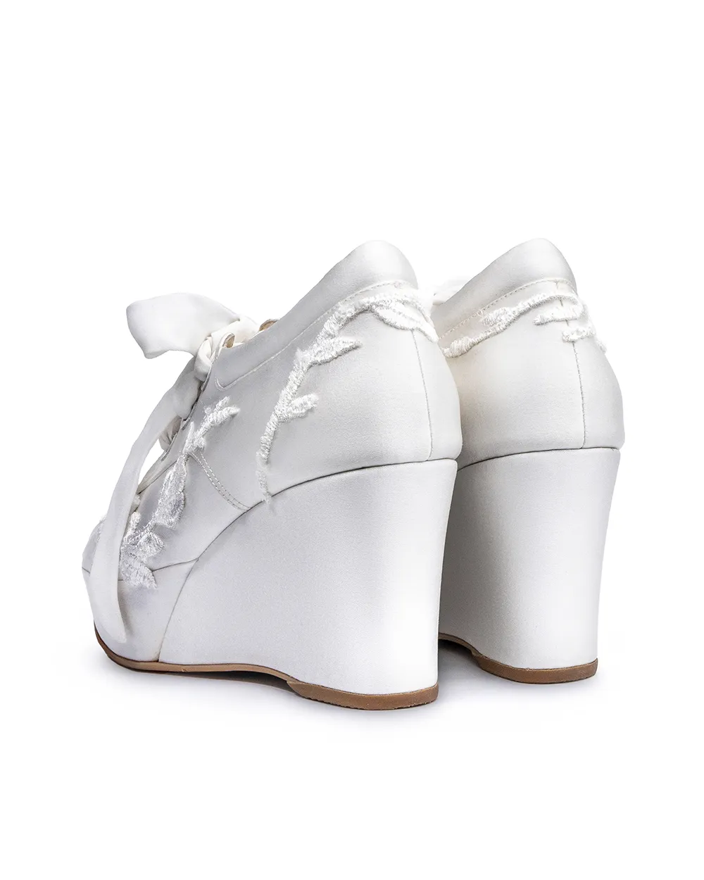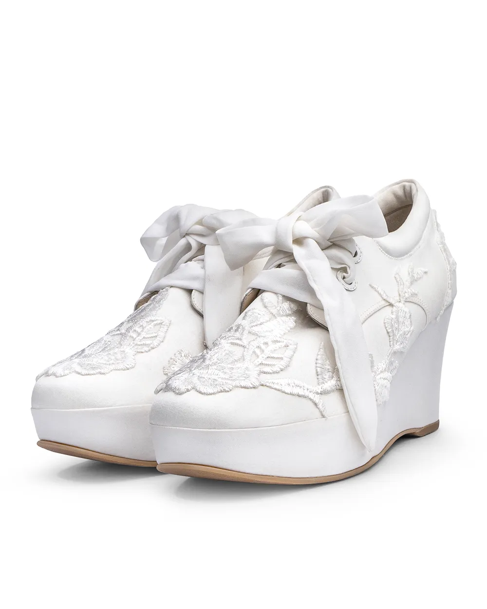 Cómodas zapatillas, elaboradas en fino raso con sutiles piezas de encaje en tono Ivory, acompañado de pasadores de seda y un cómodo tacón corrido para tu día especial.